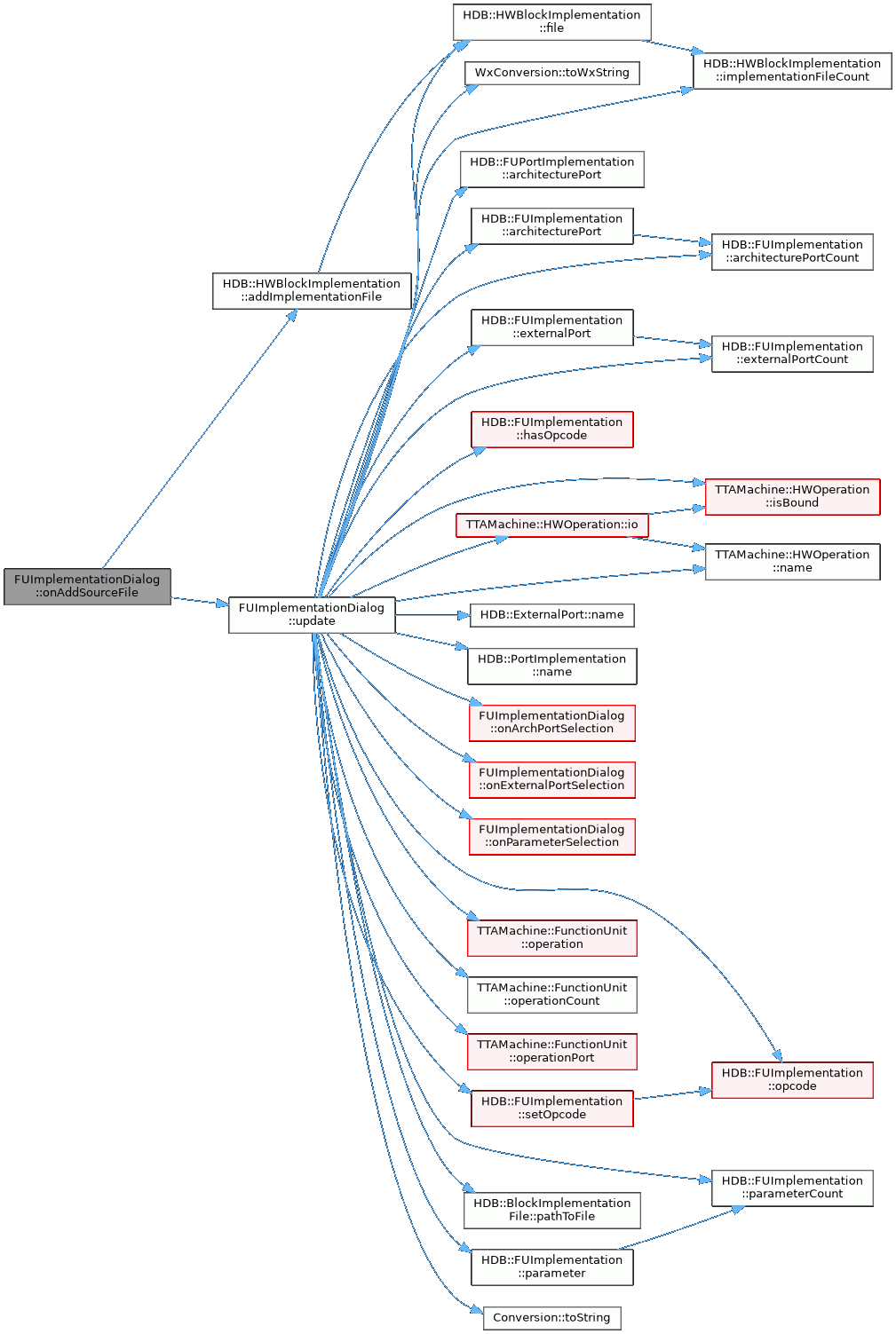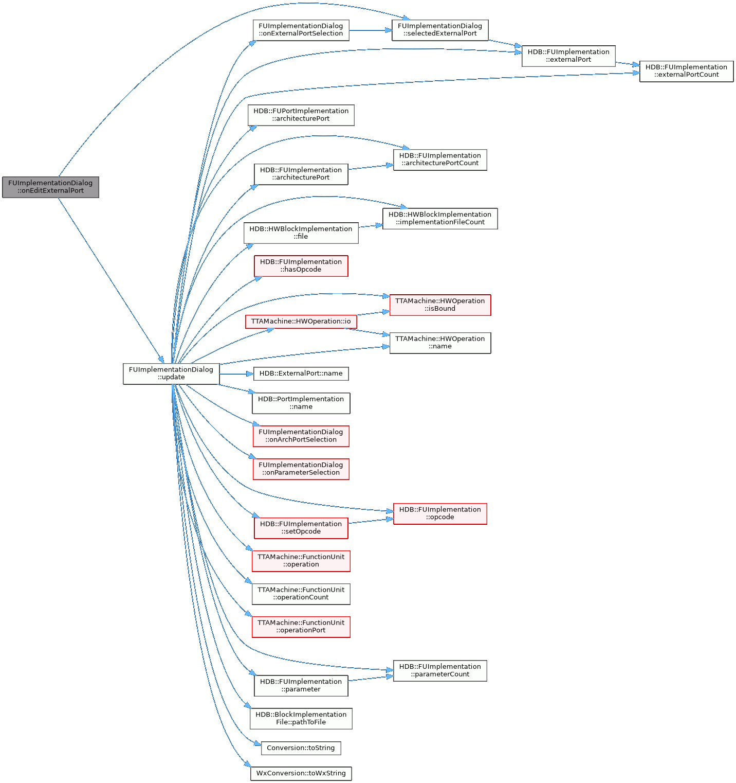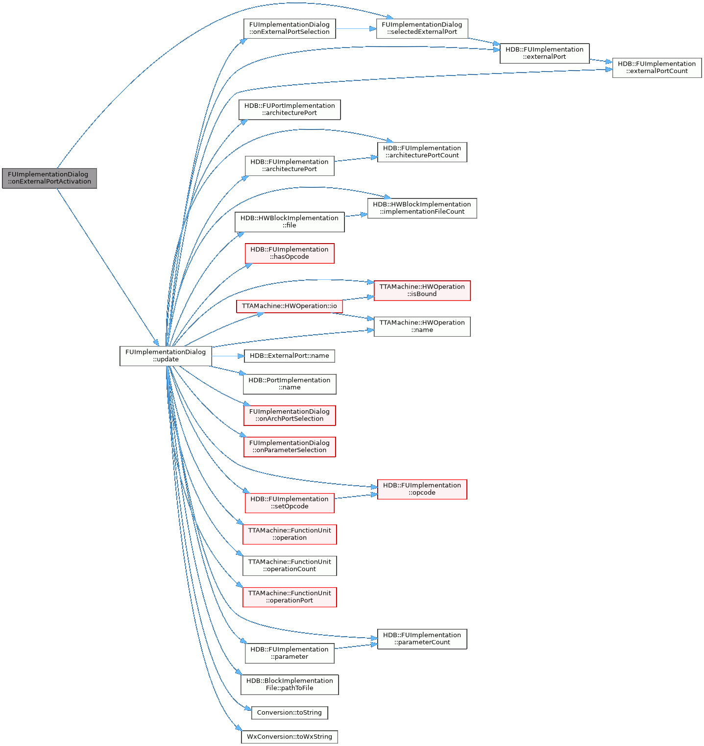 References architecture_, HDB::FUPortImplementation::architecturePort(), HDB::FUImplementation::architecturePort(), HDB::FUImplementation::architecturePortCount(), archPortList_, dummy, HDB::FUImplementation::externalPort(), HDB::FUImplementation::externalPortCount(), externalPortList_, HDB::HWBlockImplementation::file(), HDB::FUImplementation::hasOpcode(), implementation_, HDB::HWBlockImplementation::implementationFileCount(), TTAMachine::HWOperation::io(), TTAMachine::HWOperation::isBound(), HDB::ExternalPort::name(), HDB::Parameter::name, HDB::PortImplementation::name(), TTAMachine::HWOperation::name(), onArchPortSelection(), onExternalPortSelection(), onParameterSelection(), HDB::FUImplementation::opcode(), opcodeList_, opcodeWarningShowed_, TTAMachine::FunctionUnit::operation(), TTAMachine::FunctionUnit::operationCount(), TTAMachine::FunctionUnit::operationPort(), HDB::FUImplementation::parameter(), HDB::FUImplementation::parameterCount(), parameterList_, HDB::BlockImplementationFile::pathToFile(), HDB::FUImplementation::setOpcode(), sourceList_, Conversion::toString(), WxConversion::toWxString(), HDB::Parameter::type, and HDB::Parameter::value.