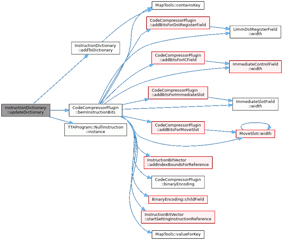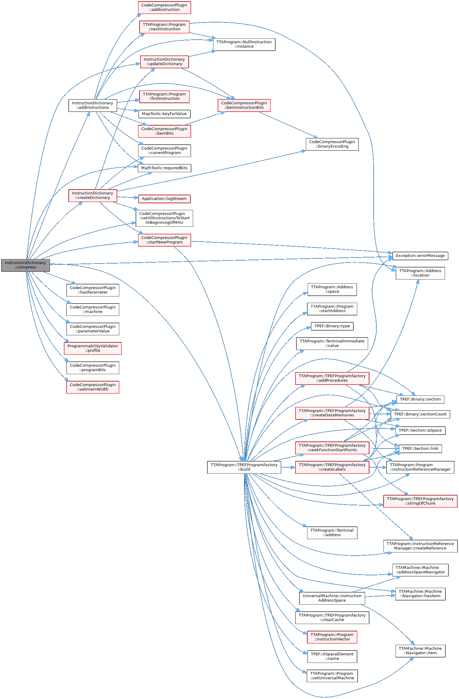 References __func__, addInstructions(), assert, TTAProgram::TPEFProgramFactory::build(), compatibilityProgDone_, createDictionary(), dictionary_, dictionaryCreated_, ENSURE_PROGRAMMABILITY, Exception::errorMessage(), CodeCompressorPlugin::hasParameter(), CodeCompressorPlugin::machine(), CodeCompressorPlugin::parameterValue(), ProgrammabilityValidator::profile(), CodeCompressorPlugin::programBits(), MathTools::requiredBits(), CodeCompressorPlugin::setAllInstructionsToStartAtBeginningOfMAU(), CodeCompressorPlugin::setImemWidth(), CodeCompressorPlugin::startNewProgram(), updateDictionary(), and YES.